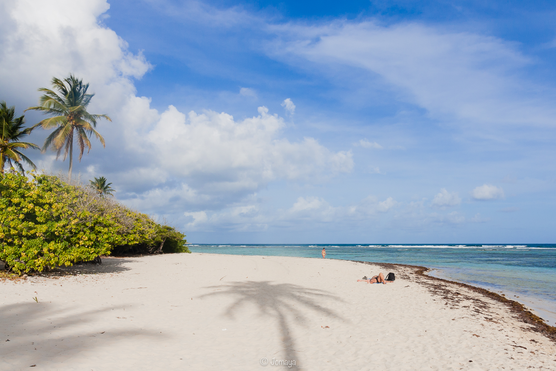 Etape suivante : Sainte Anne, l’un des grands sites touristiques de Grande Terre. On s’installe à la table de l’un des restaurants qui s’alignent sur la plage publique. Quoi de mieux que d’être les pieds dans le sable, avec un bon plat de poisson et une bière, face à la mer ? c’est un peu le rêve. Après déjeuner, on se promène le long des 2 principales plages de Sainte Anne, la plage municipale et la plage de la Caravelle (la fameuse plage du Club Med), parmi les plus belles de Guadeloupe. Il y a beaucoup d’activités sur les 2 plages, entre baigneurs, jetski, kayaks, boutiques de souvenirs. Après un petit sorbet coco et un petit tour dans le charmant centre ville de Sainte Anne, on décide de mettre les voiles à la recherche d’une plage un peu moins « agitée ».