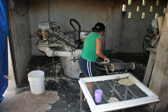 Dans les rues du village, on croise les commerces traditionnels : une boucherie en plein air (on est loin des normes d'hygiène occidentale), un moulin où chacun vient faire moudre son maïs, mais aussi fabriquer les tortillas, ces galettes de maïs typiquement mexicaine. Dehors la chaleur est forte, mais à l'intérieur, à proximité des fours, c'est insupportable. Mais par contre, les tortillas brûlantes, sorties tout juste des fours, c'est délicieux !!
