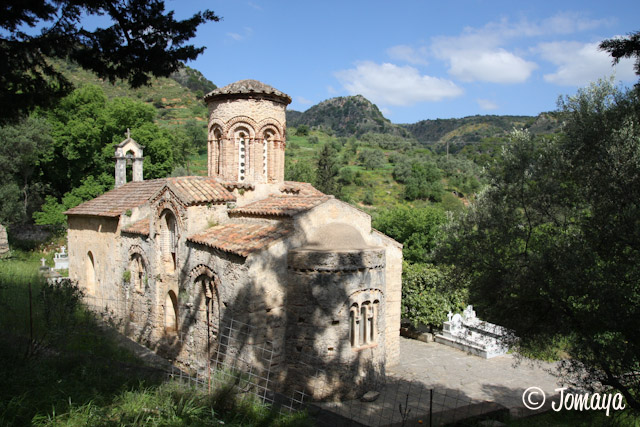 Premier étape, Kiriakoselia, au Sud de La Canée, un peu après l’intersection de la route pour Hora Sfakion. Notre guide nous promet une petite église byzantine nichée dans une vallée boisée. La route s’élève effectivement à travers bois. Les paysages sont encore différents de ceux vus les jours précédents. Première difficulté, trouver l’église. Le GPS nous emmène bien à Kiriakoselia, mais là, aucune indication sur la direction de l’Eglise en question. On tourne en rond et on finit par tomber par hasard sur l’endroit, qui est bien sûr est fermé. On passe entre les barrières pour accéder au cimetière et à la très belle église Agios Nikolaos (Saint Nicolas). C’est tout petit, mais ce cadre un peu perdu au milieu de nulle part, la proximité de la forêt, donne un charme certain au lieu.