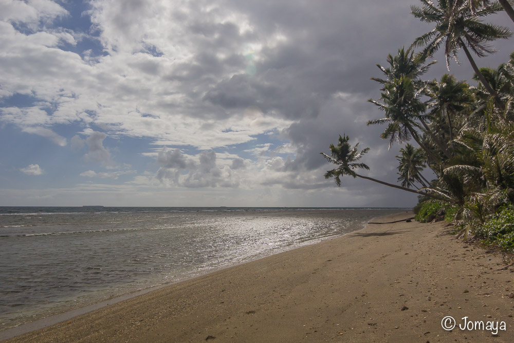 Réveil matinal au camping. Le temps est frais et couvert, la journée ne s’annonce pas des plus belles. On remballe la tente et le reste du matériel et en route pour les paysages sauvages de la côte Est. Mais avant ça, petite balade facile au pied des falaises de Lindéralique. La promenade commence au camping du billet de 500 (accès payant à la tribu, 500 CFP). On démarre sur la célèbre plage du billet de 500, celle , donc, qui figure sur le billet du même montant. La falaise de calcaire noir s’avance sur la mer. De gros nuages noirs s’amoncellent et la pluie s’invite à la fête. Nous nous réfugions régulièrement à l’abri des palmiers et arbres qui bordent la plage. Le soleil pointe entre les nuages, les averses alternent avec les éclaircies. Au bout de la plage, retour par la petite route qui traverse cocoteraies, jardins, … Juste au pied des célèbres falaises noires. Impressionnantes.